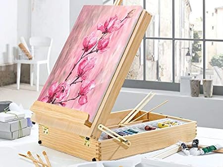 Mallette De Peintures Avec 2 Toiles Et Chevalet De Table En Bois