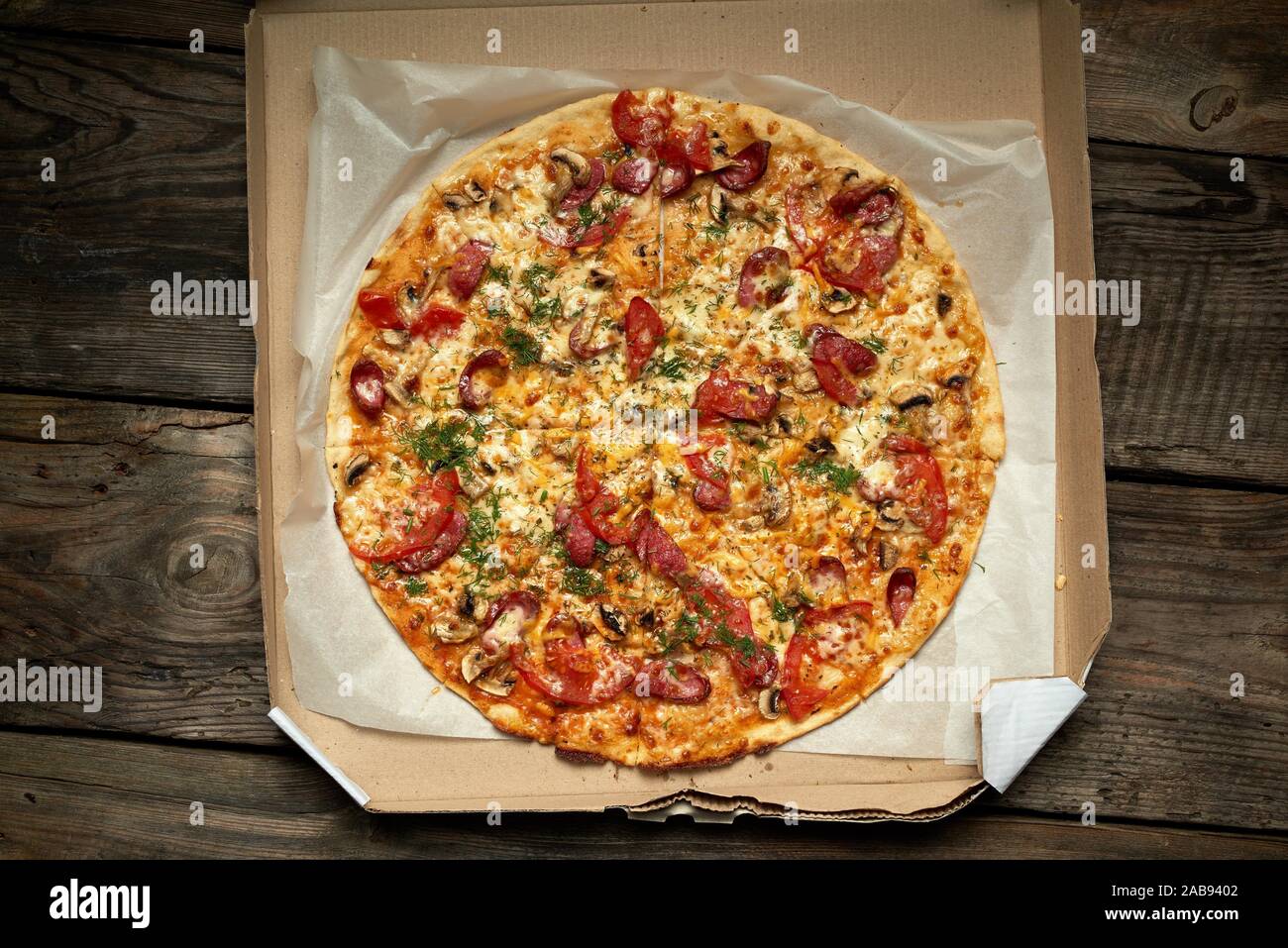 Baked Round Pizza With Smoked Sausages Mushrooms Tomatoes