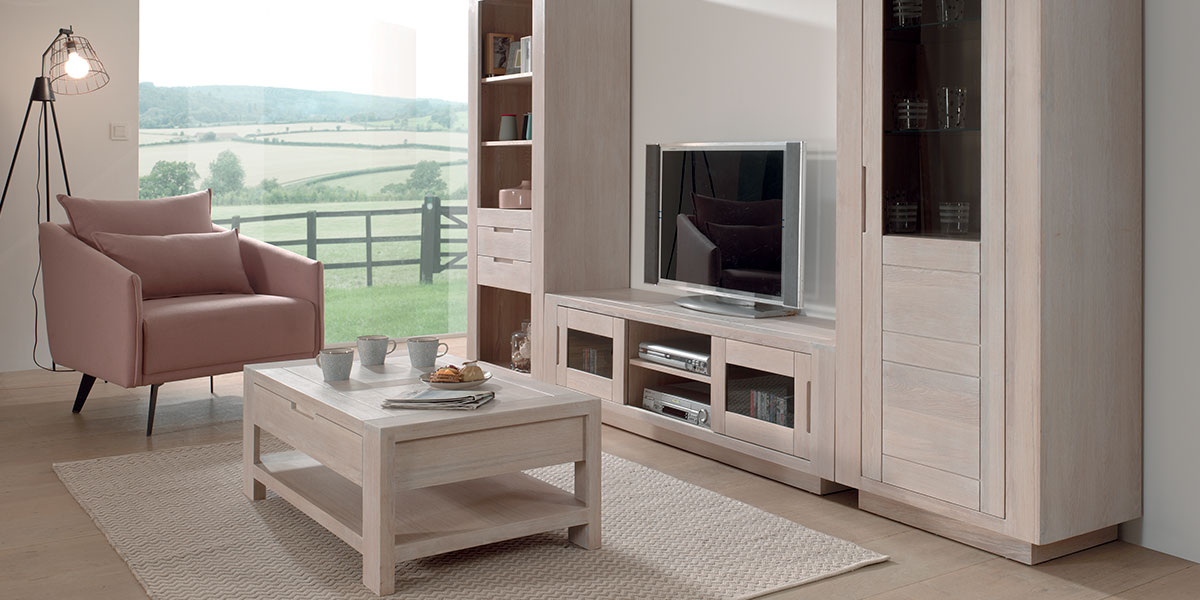 Table Basse Chene Massif Cire Blanchi Double Plateaux 120x70x39cm