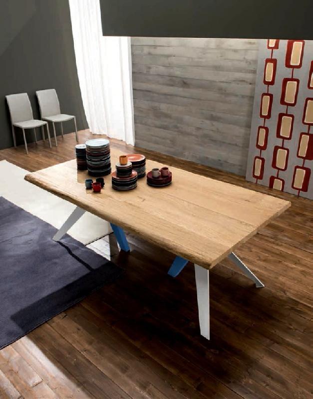 Trio Table Repas En Chene Naturel Pietement En Bois Blanc Et Bleu