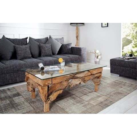 Table Basse Base En Bois Flotte Et Plateau Verre Trempe